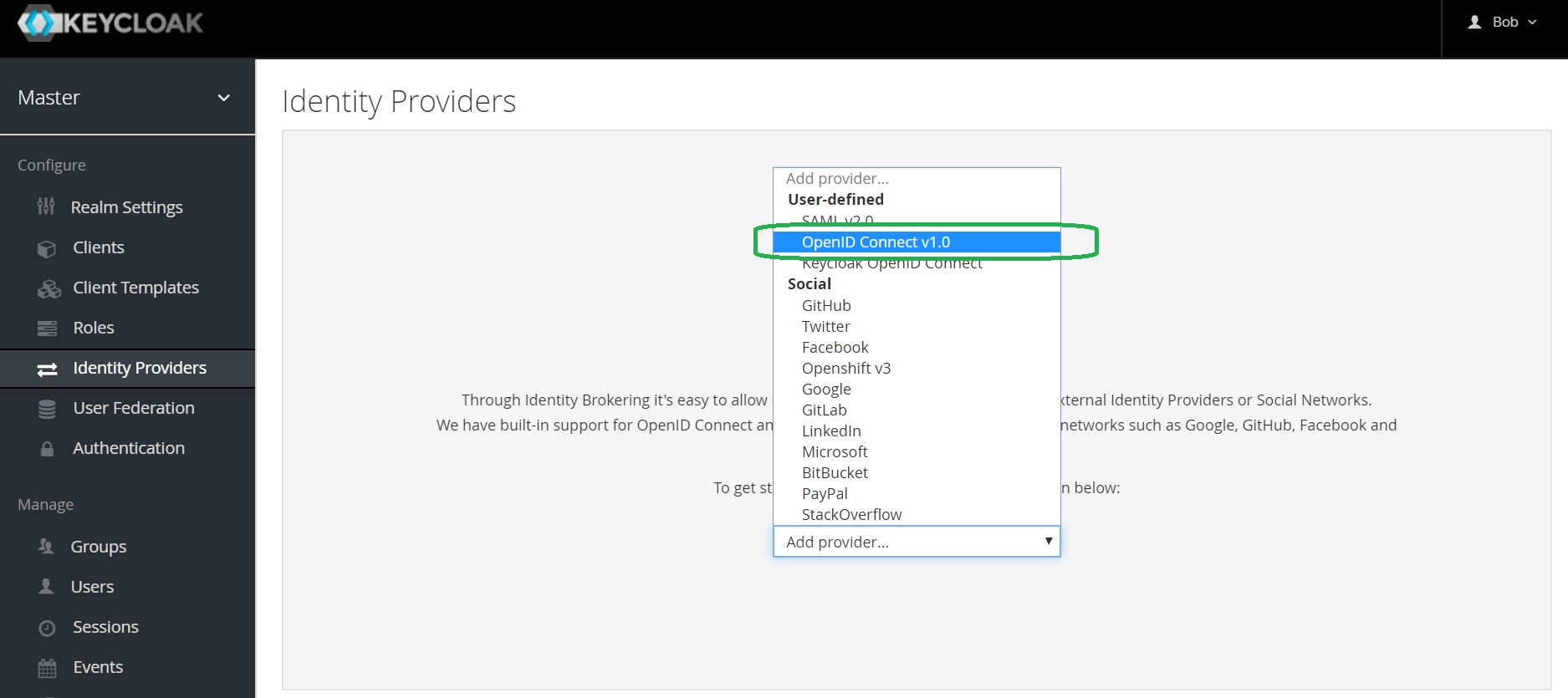 Open Keycloak admin page, open Identity Providers, select the OpenID Connect v1.0 provider from the list of providers.
